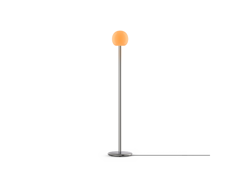 Stehleuchte aus polierten Alumium mit mundgebeblasenen Glas.