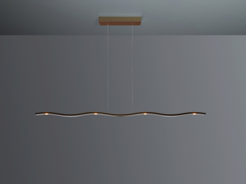 Elegante, wellenförmige Pendelleuchte in bronze eloxiert, die sowohl direktes als auch indirektes Licht spendet. Die Leuchte ist separat schalt- und dimmbar über integrierte Taster und ermöglicht durch die Dim-to-Warm-Funktion eine warme, gemütliche Lichtatmosphäre, indem sie die Farbtemperatur flexibel anpasst.