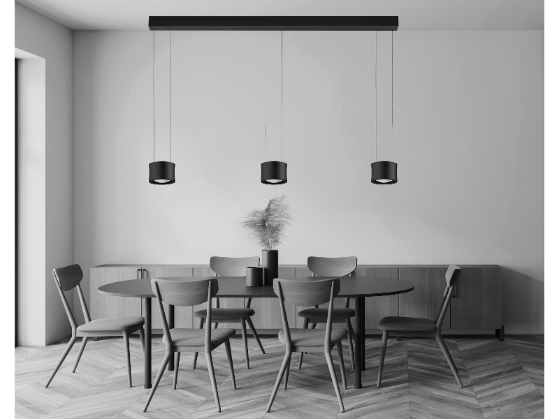 3er Pendelleuchte schwarz matt, mit Linseoptik und Dimto warm Technologie, höhenverstellbar 50-180cm.