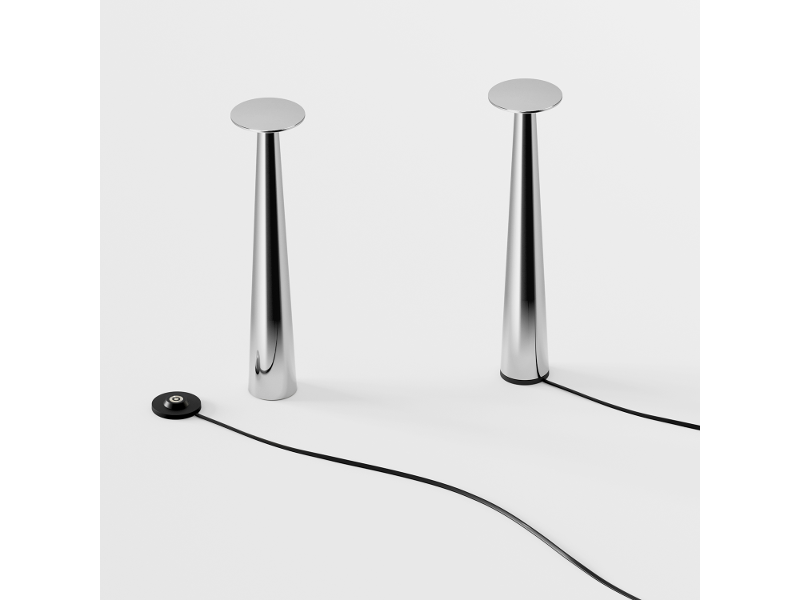 Akku-Tischleuchte in Chrom glänzend mit dim to amber vom 2700zu 1800 Kelvin.