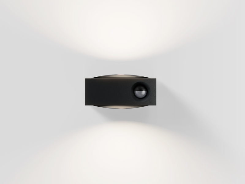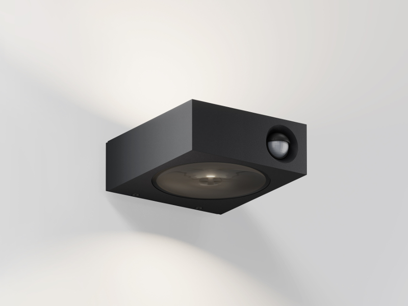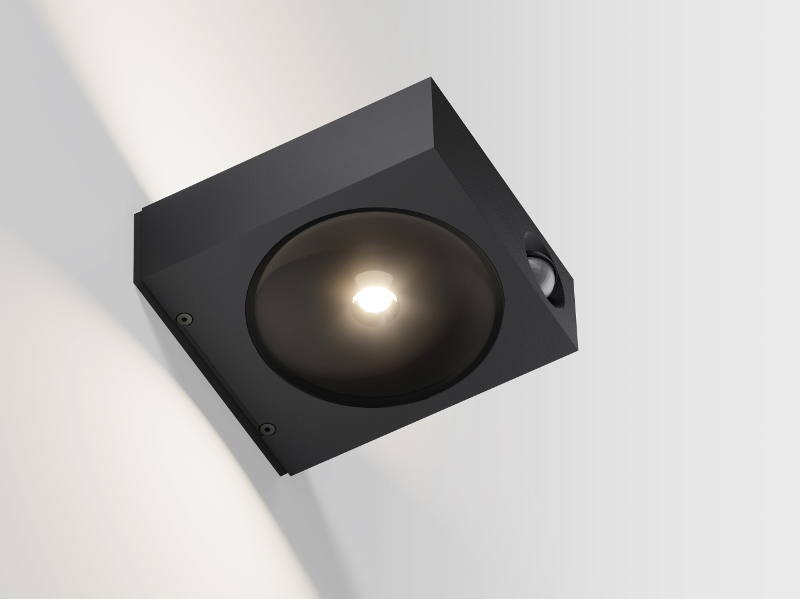 Außenleuchte in schwarz mit einer wertigen Glaslinsen, die ein klar konturiertes Licht hervorbringt.