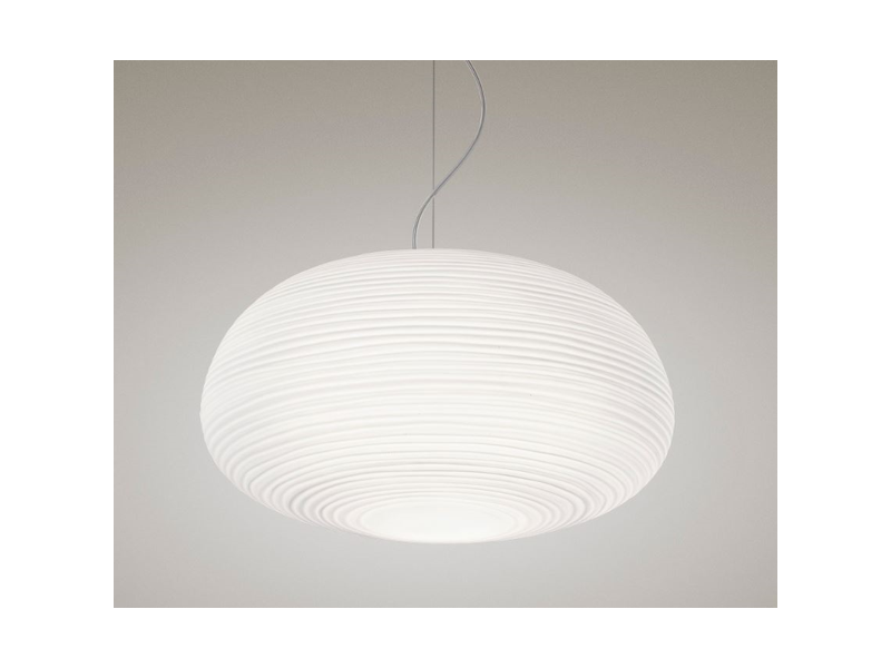 Pendelleuchte in breiter, flacher Form aus mundgeblasenem Glas mit kalkhaltigem Aussehen und feinen Einschnitten.