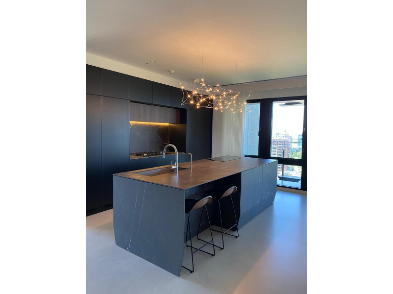 Lichtskulptur als Hängeleuchte, bestehend aus filigranen Metallstäben und kleinen LED-Platinen, die der Leuchte ihre elegante Form und Struktur verleihen.